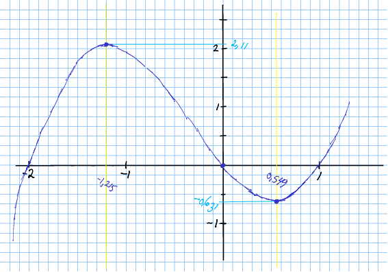 Dette gjev og . Vidare ser me at er stor (positiv) for store og små verdiar av . Dvs. at aukar fram til , fell vidare til , og til slutt stig igjen.